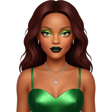 Rihanna with hazel green eyes, long dark auburn hair, light green eyeshadow, black lipstick, green metallic sweetheart dress, silver necklace and earrings emoji
