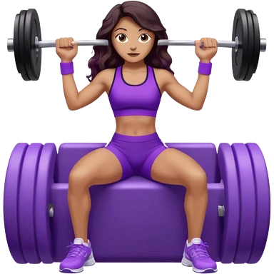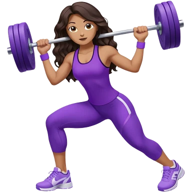 mujer de tez trigueña, con cabello castaño oscuro ondulado hasta la cadera estilizado, con ropa deportiva morada/lila, tenis blancos deportivos y levantando una pesa emoji