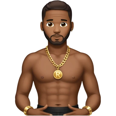 R Kelly with dark brown hair, metallic black pants, shirtless with necklace emoji