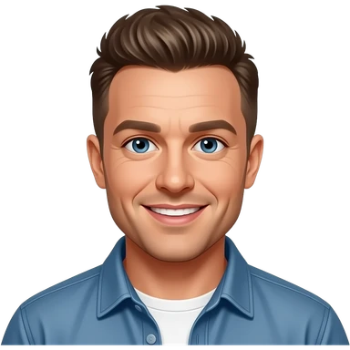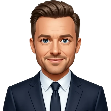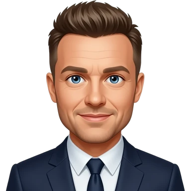 Robbie Williams with dark brown hair, green eyes, suit emoji