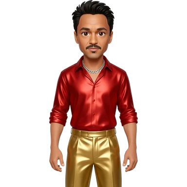 Robert Downey Jr with brown eyes, black hair, red metallic shirt, gold metallic baggy pants, silver necklace emoji
