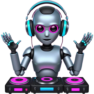 Robot DJ with bright glowing neon pink and neon green lights around turntables, wearing black with neon blue glowing headphones, 8k emoji