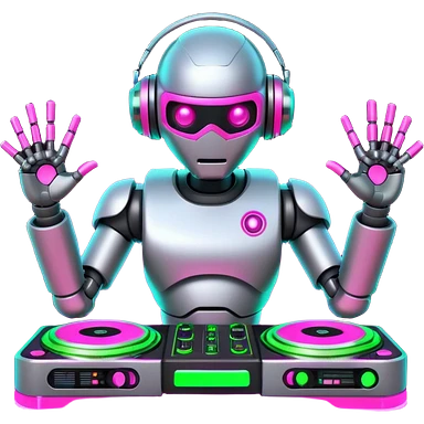 Robot DJ with bright glowing neon pink and neon green lights around turntables, 8k emoji