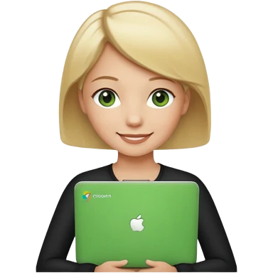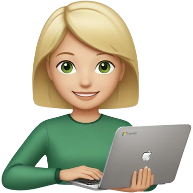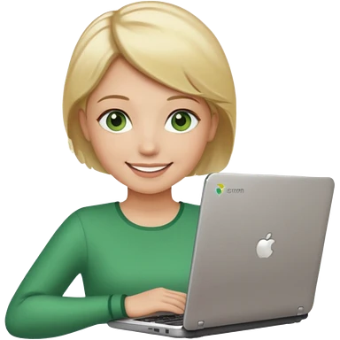 short blonde hair teacher green eyes woman happy holding chromebook emoji