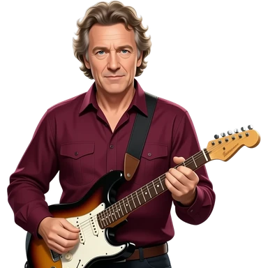 tousled-haired guitarist Mark Knopfler in a dramatic playing pose, burgundy, luxurious shirt - backlit by spotlights emoji