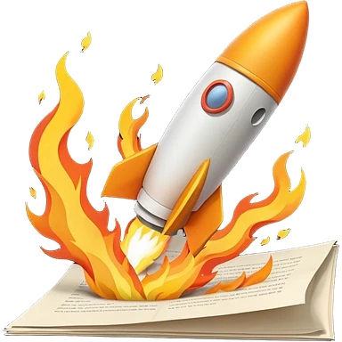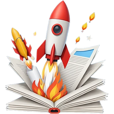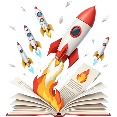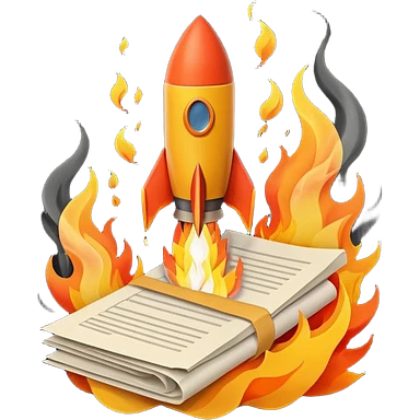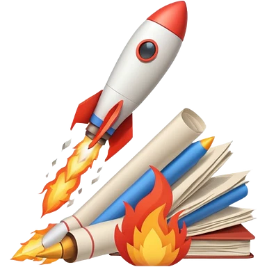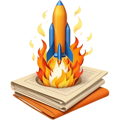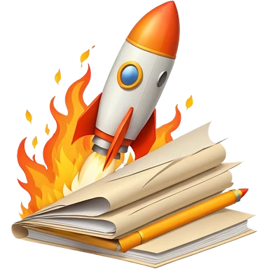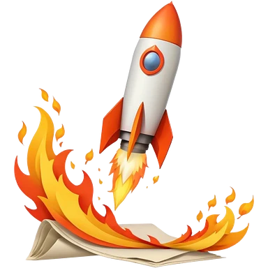 Rocket launching from stack of papers, fire trail, minimal flat design emoji
