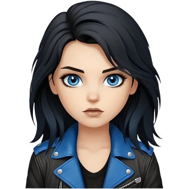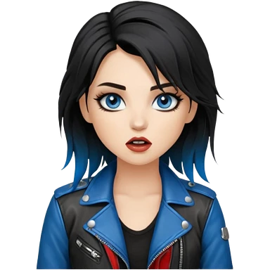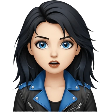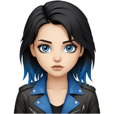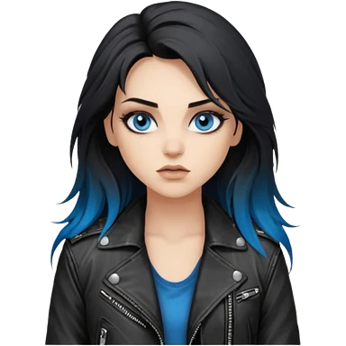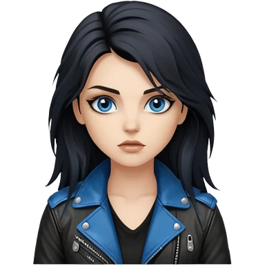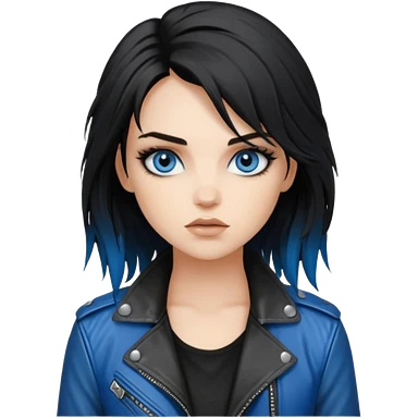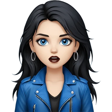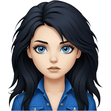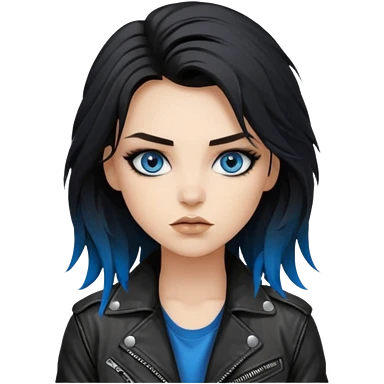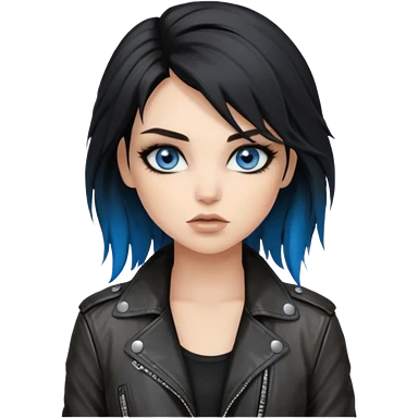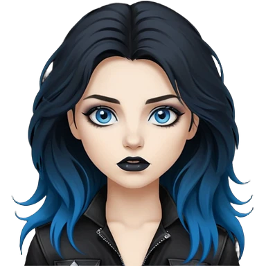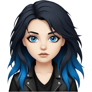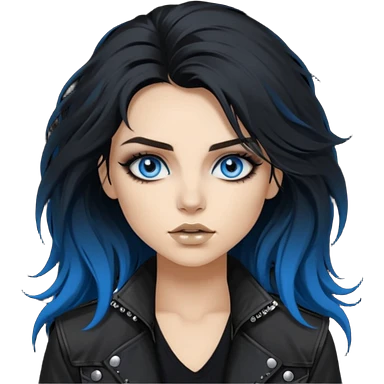 rockstar girl with long total black disheveled hair, blue eyes, Smokey eyes rockstar grunge makeup, rocking emoji