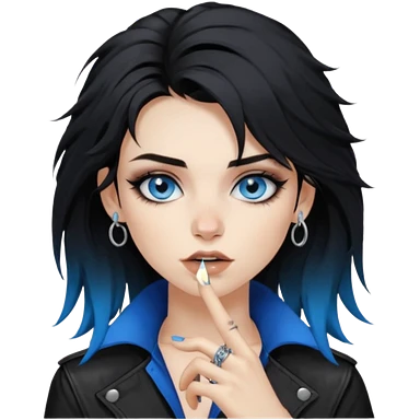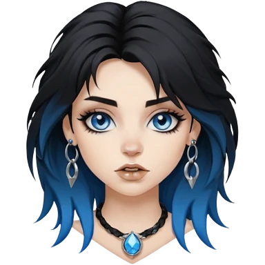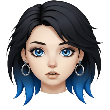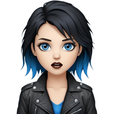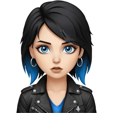 rockstar girl with black disheveled hair, blue eyes, Smokey eyes grunge makeup, emoji