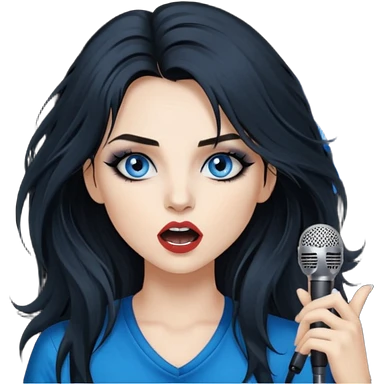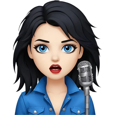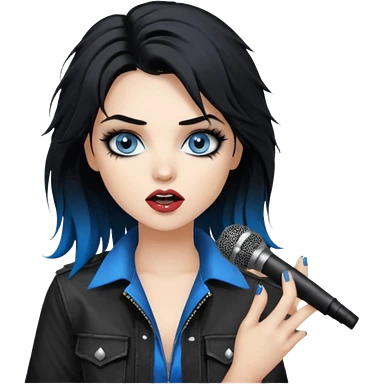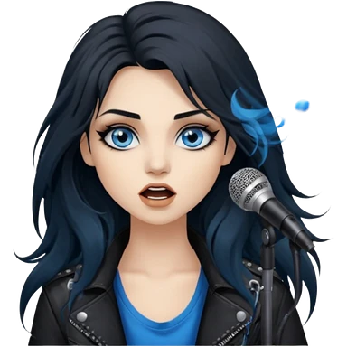 rockstar girl with long black disheveled hair, blue eyes, Smokey eyes grunge makeup, singing emoji