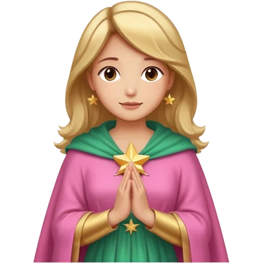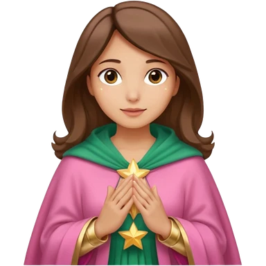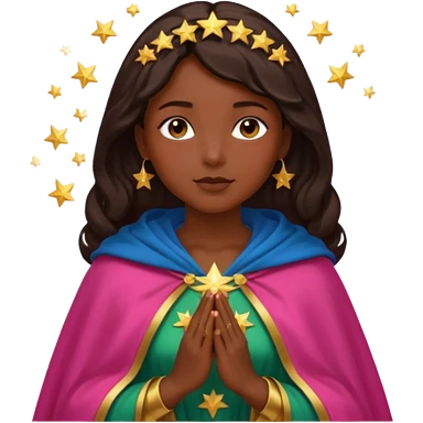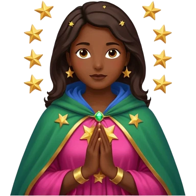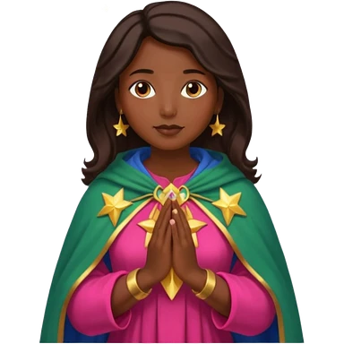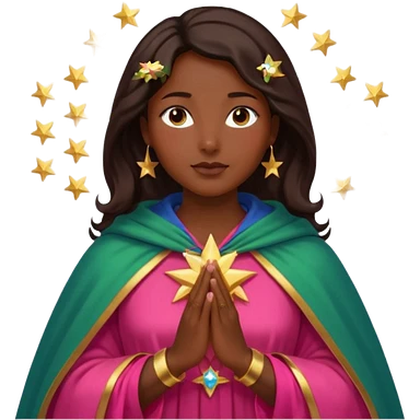Mujer de piel morena, rostro sereno, manos juntas. Vestido rosa rojizo manto capa azul verdoso con muchas estrellas doradas pequeñas Resplandor como rayos de luz dorado alrededor del cuerpo. emoji