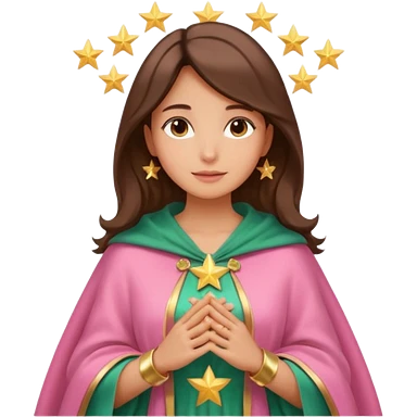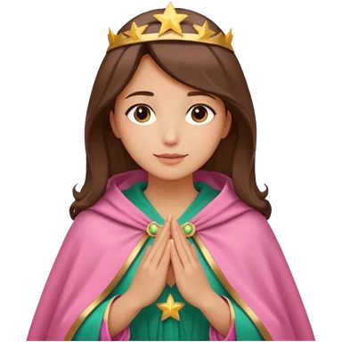 Mujer de piel morena, rostro sereno, manos juntas. Vestido rosa, manto azul verdoso con estrellas doradas. Resplandor dorado alrededor del cuerpo. emoji