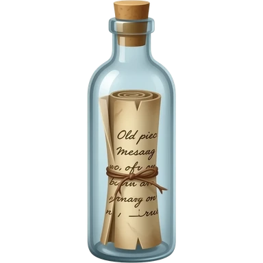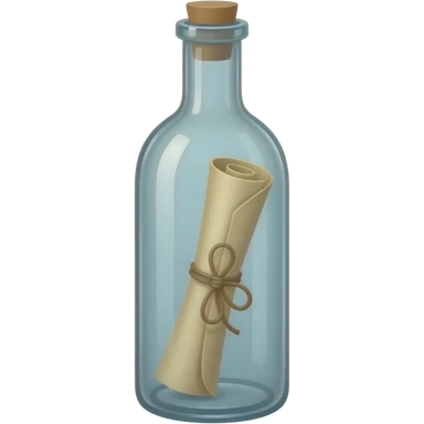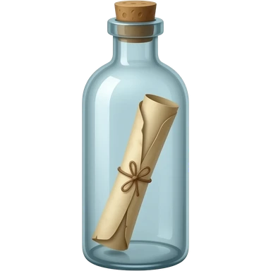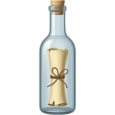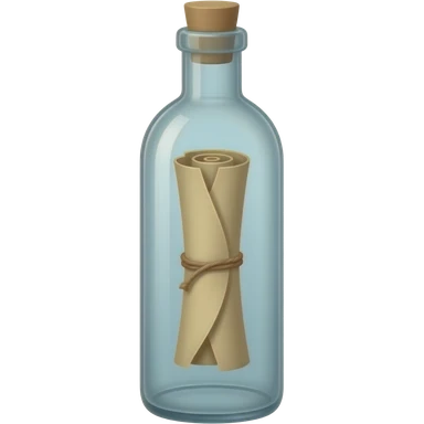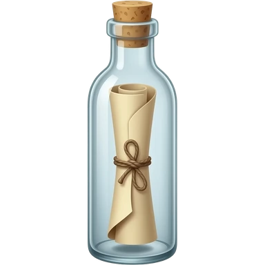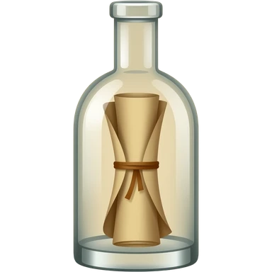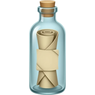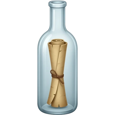 A tall, thin glass bottle containing a rolled-up message in an old piece of paper, with the message positioned exactly in the center of the bottle. The roll should look truly natural, with natural curves and a three-dimensional appearance. emoji