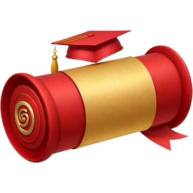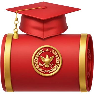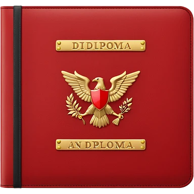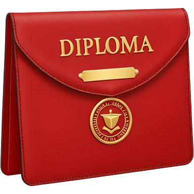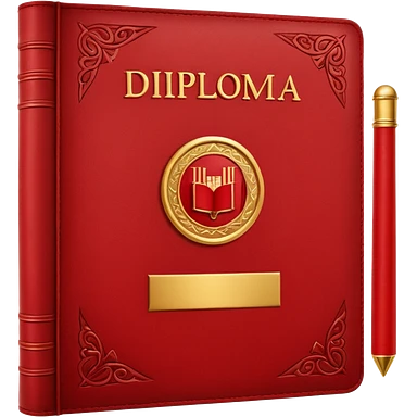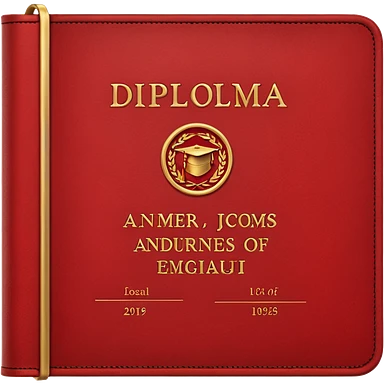 prestigious red diploma cover with gold embossed text on the front. The cover is slightly open, revealing a white certificate inside. The gold lettering glows subtly, giving it an elegant and official look. The diploma is placed at a slight angle for a professional appearance. The background is plain white emoji