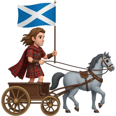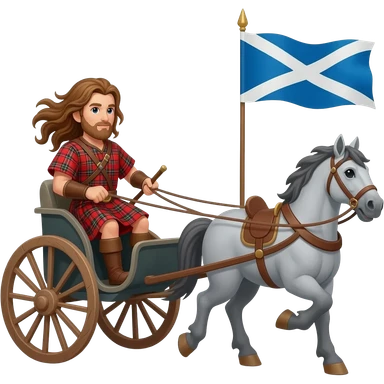Warrior driving chariot wearing red tartan kilt with long brown flowing hair carrying a Scottish flag, pulled by a grey horse emoji