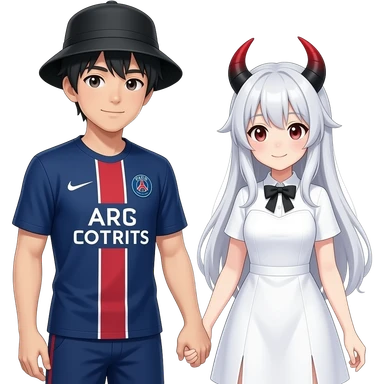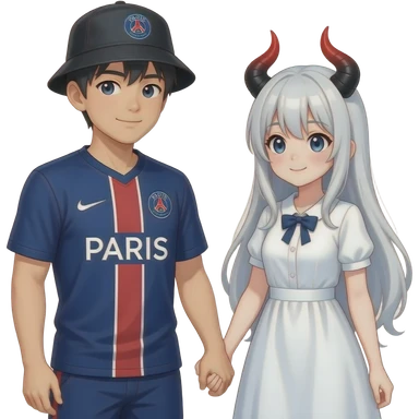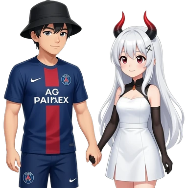 romantic date holding hands. The guy is asian an wears a black fishing hat and a dark blue soccer tricot from PSG. The girl is dressed as an anime girl with a white wig, white dress and black-red horns emoji