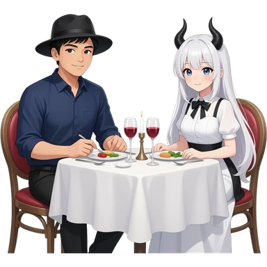 romantic date at a dinner table. The guy is asian an wears a black fishing hat and a dark blue shirt. The girl is dressed as an anime girl with a white wig and black horns emoji
