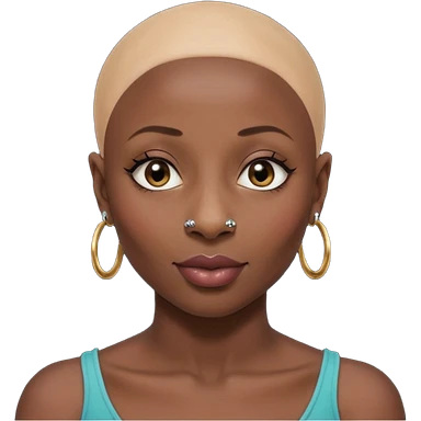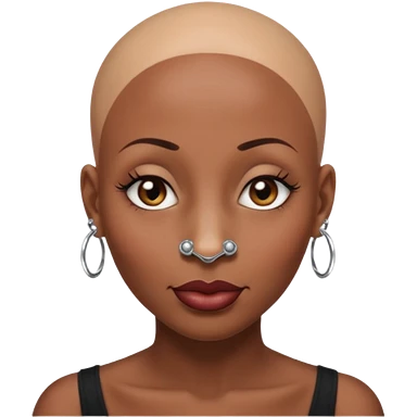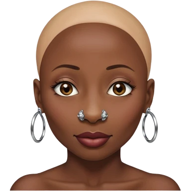 Grown black (proud) woman, bald with a perfect head, a prominent nose with a septum piercing, many piercings on her ears, a gap between her front teeth and very long nails emoji
