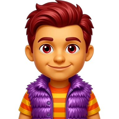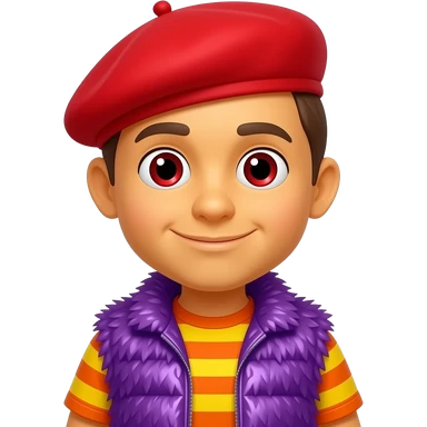 Moe Doodle from The Doodlebops with yellow-orange skin, red eyes, red heavily mop-top hair, red beret, orange and yellow striped metallic shirt, purple metallic shaggy fur vest emoji