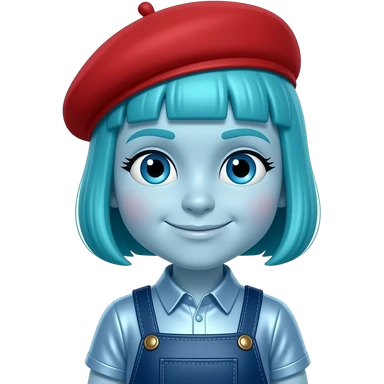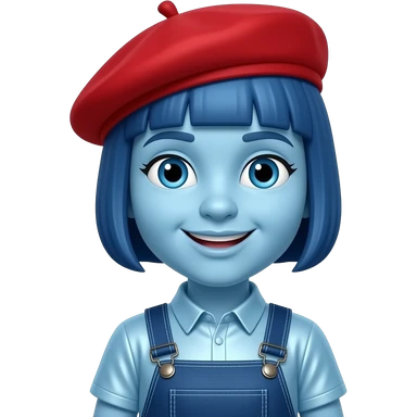Rooney Doodle from The Doodlebops with light blue skin, blue eyes, blue teddy bear cut hair, red beret, light blue metallic shirt, dark blue metallic overalls emoji | AI Emoji Generator