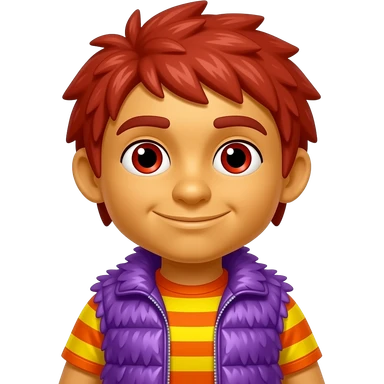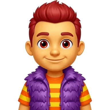 Moe Doodle from The Doodlebops with yellow-orange skin, red eyes, medium red heavily mop-top hair, orange and yellow striped metallic shirt, purple metallic shaggy fur vest emoji