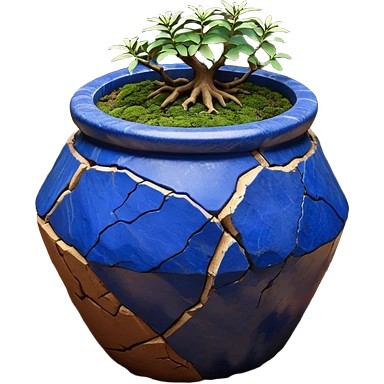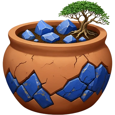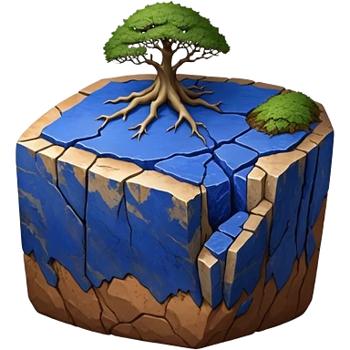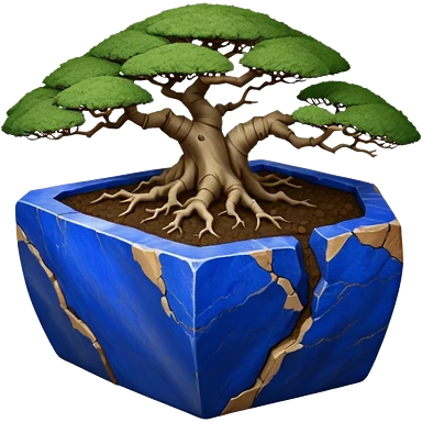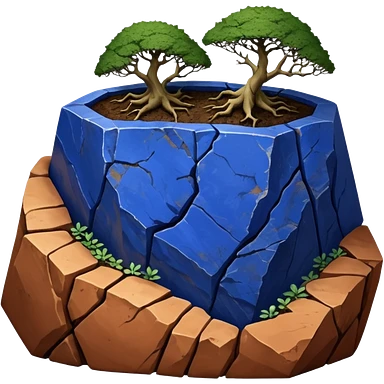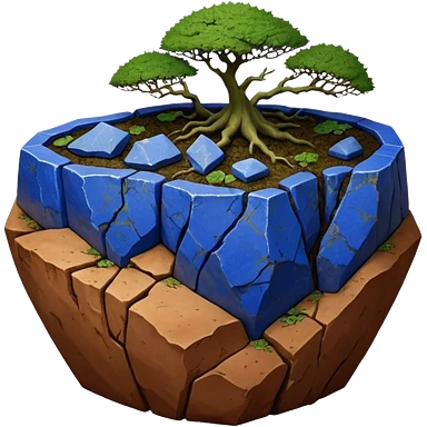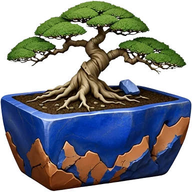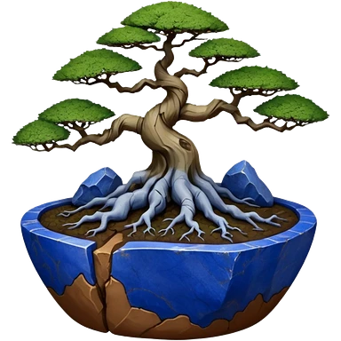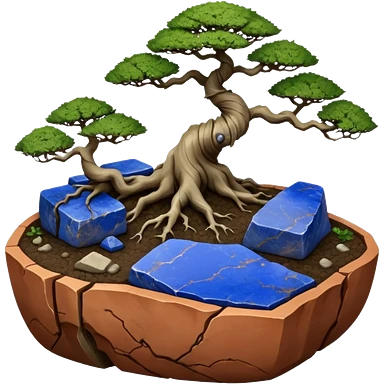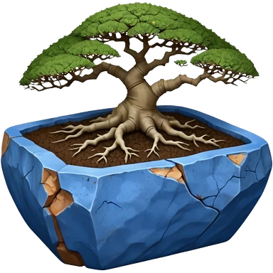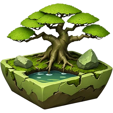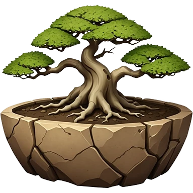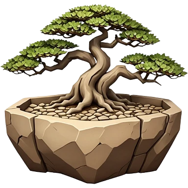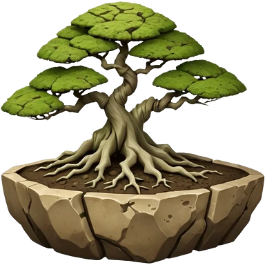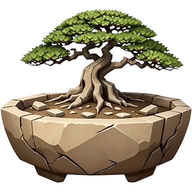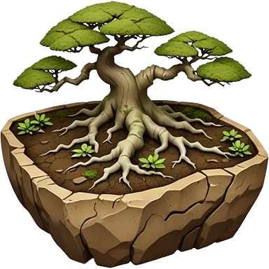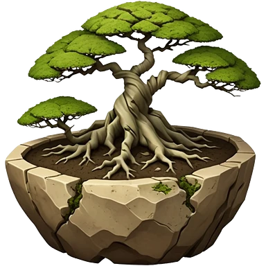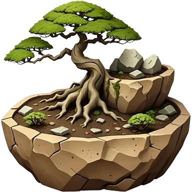Roots Stoneware akadama moss on soil irregular angular Stone Age rocks cracked crags and broken rough edges forming a very shallow bonsai pot sans(without) tree emoji | AI Emoji Generator