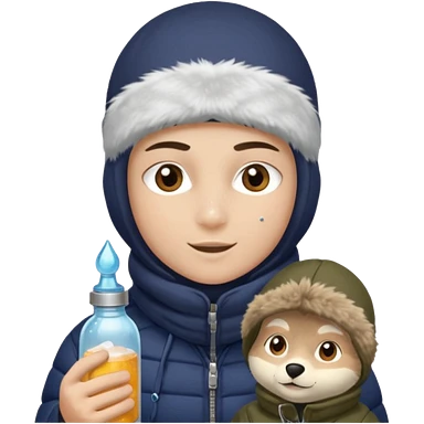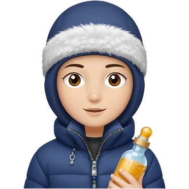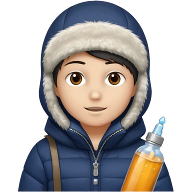 Junge mit Sturmhaube in der Rechten hand eine jacky flasche und schwarze winterjacke mit fell an der mütze 2 meter gross emoji