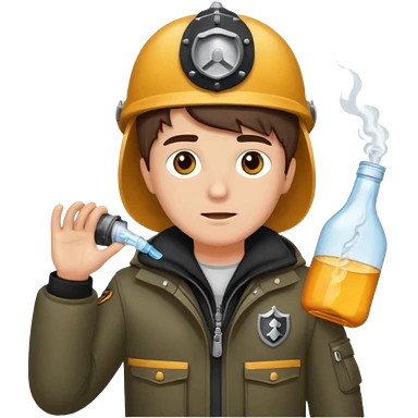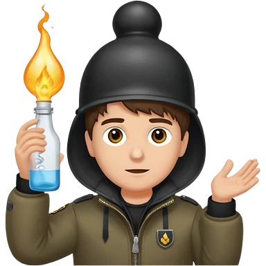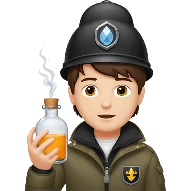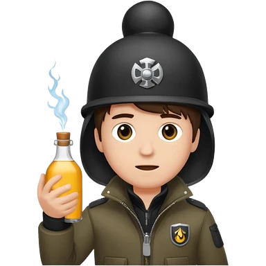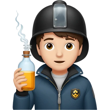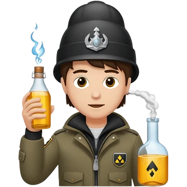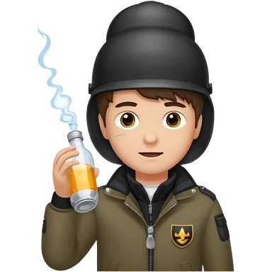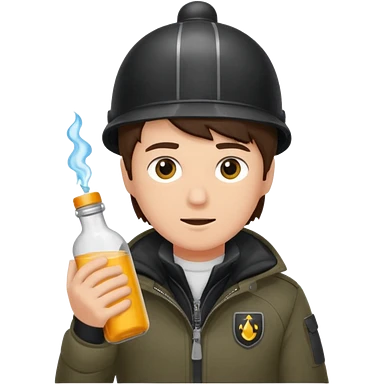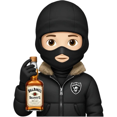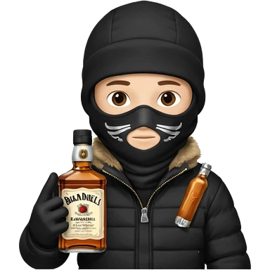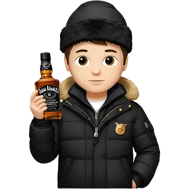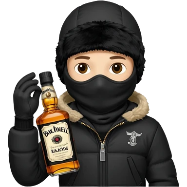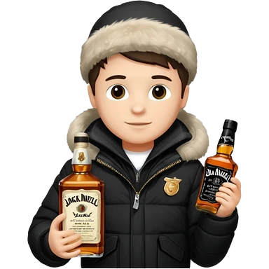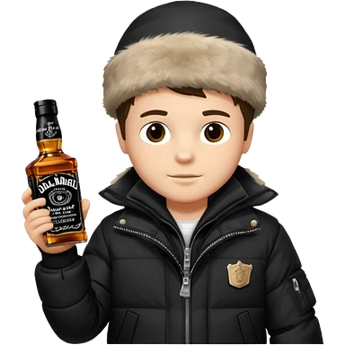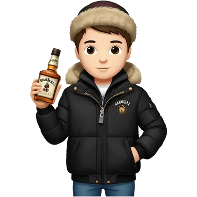 erstell ein bild Von eine jungen der braune augen hat eine sturmhaube trägt und eine Jacky flasche in der Hand hebt plus eine Jacke mit schwarzen fell emoji