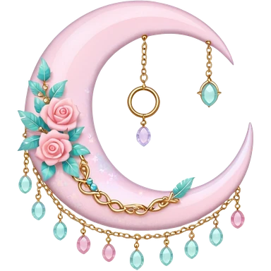 Rosy shiny glossy sparkly romantic pastel crescent damask moon with rose quartz pastel vines pastel gems pastel beads with feathers and chains emoji