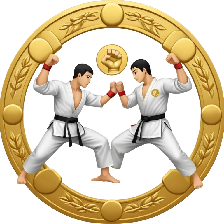 Round emblem symbolizing striking martial arts. The emblem features two fighters in dynamic stances, one delivering a powerful punch while the other defends with a block. In the center, a stylized fist and foot crossed to represent the essence of striking. emoji | AI Emoji Generator