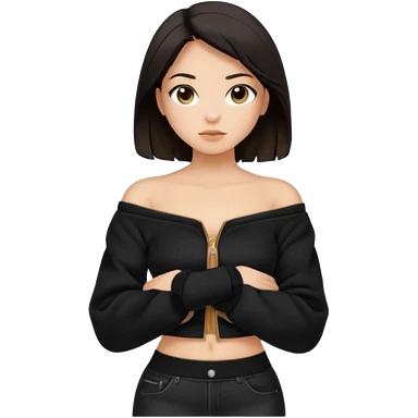 Siyah uzun saçlı ceket giyen esmerimsi kız fazla esmer değil siyah ceket polar ceket ceket gevşek biraz omzundan çıkıyormuş gibi ve bugday ten rengi soltaraftaki omzundan çıkık sadece içinde de siyah crop var crop omzundan bağlı ve sadece sol omzundan gevşek ceket emoji