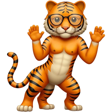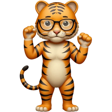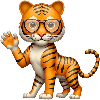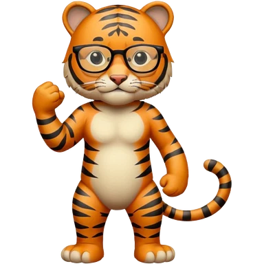 un tigre con gafas parado en dos patas con la mano en la derecha haciendo firme emoji