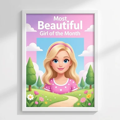 A clean aesthetic wall with a centered photo frame hanging on it, above the frame there is a sign that reads “Most Beautiful Girl of the Month”, soft lighting, minimal shadows, pastel tones, neat composition, empty frame for photo, 3D cartoon style, high quality inspired by Barbie colour palette emoji