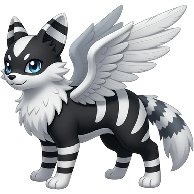 Black grey pearly silvery white albino melanistic Purrloin-Minccino-Emolga-fusion (full body) with vertical white stripes running down the whole body emoji