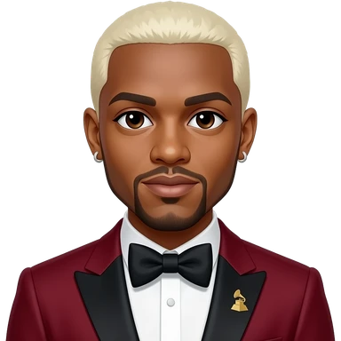 Chris Brown with dark brown eyes, white blonde buzz cut hair, dark red grammy suit with bow tie, earrings emoji