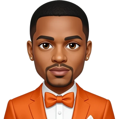 Trey Songz with dark brown eyes, black buzz cut hair, orange grammy suit with bow tie, earrings emoji