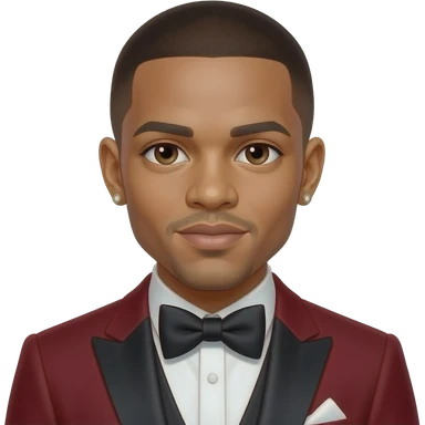 Chris Brown with dark brown eyes, dark brown buzz cut hair, dark red grammy suit with bow tie, earrings emoji
