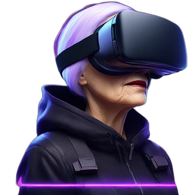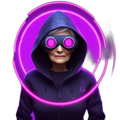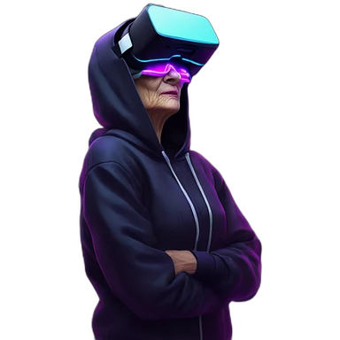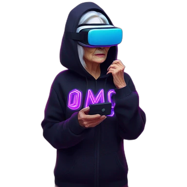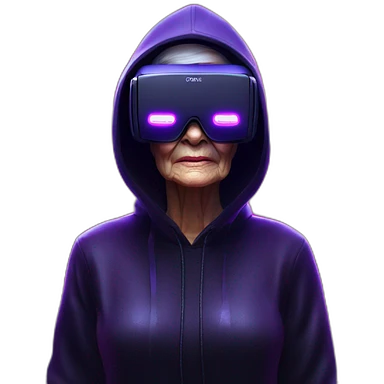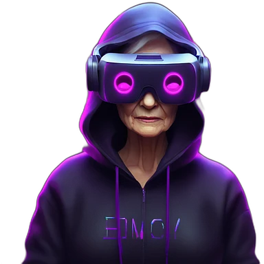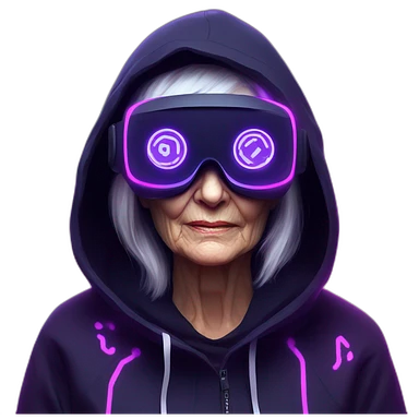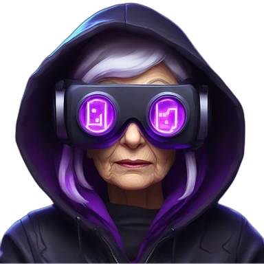Russian old man wearing a black hoodie with "OMG" letters on it and VR headset in a cyberpunk VR environment with violet neon lighting. emoji | AI Emoji Generator
