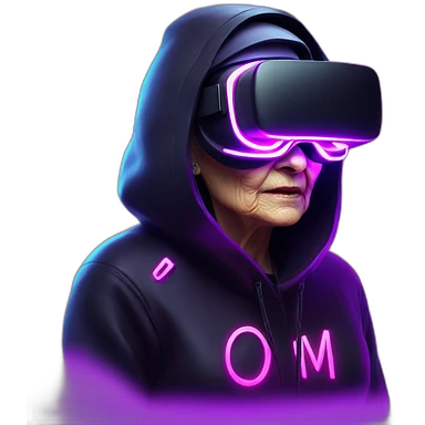 Russian old man wearing a black hoodie with "OMG" letters on it and VR headset in a cyberpunk VR environment with violet neon lighting.emoji