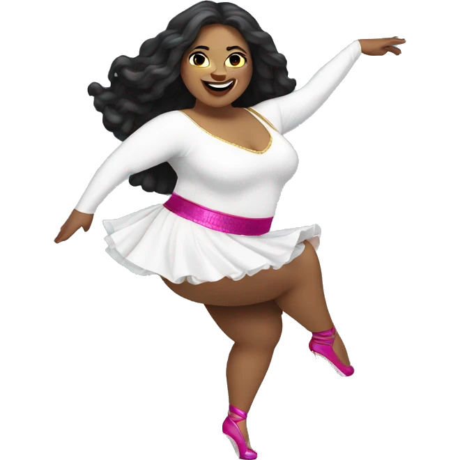 A plus-size light-skinned Black woman is wearing makeup. She has long, straight, waist-length black hair and is wearing a green sleeveless dress with rhinestones and lace and a low neckline. She is standing in green high heels and is holding a crayon in one hand, with the other hand raised. emoji