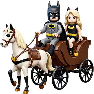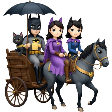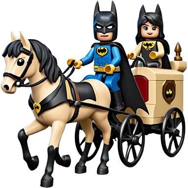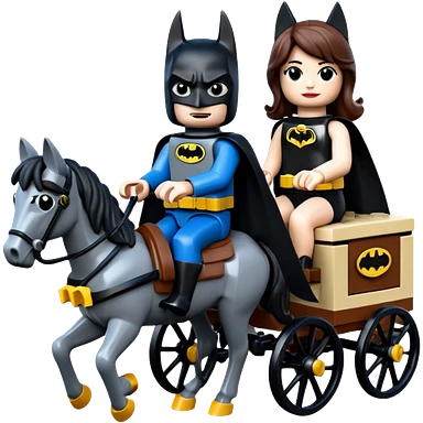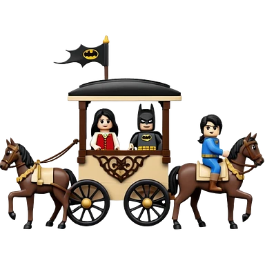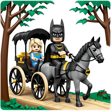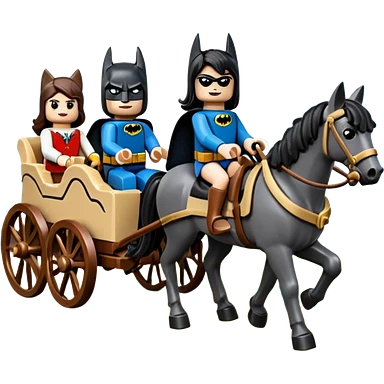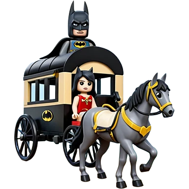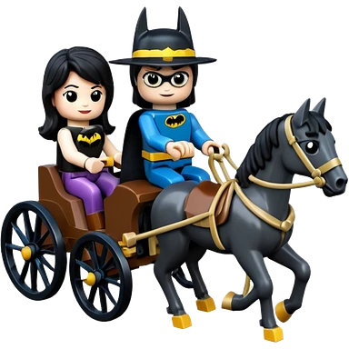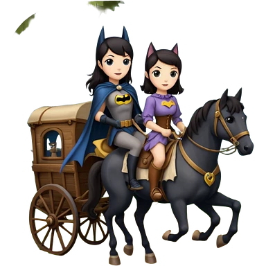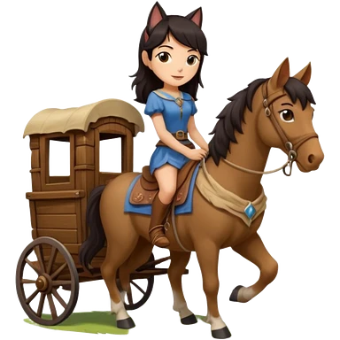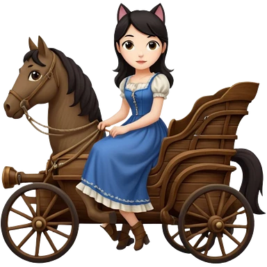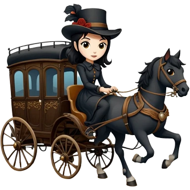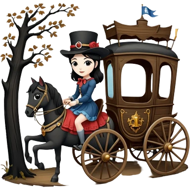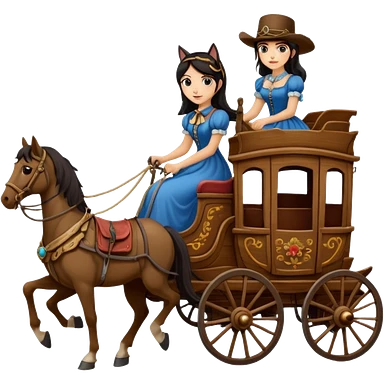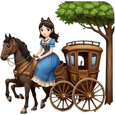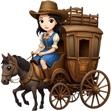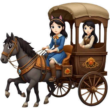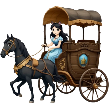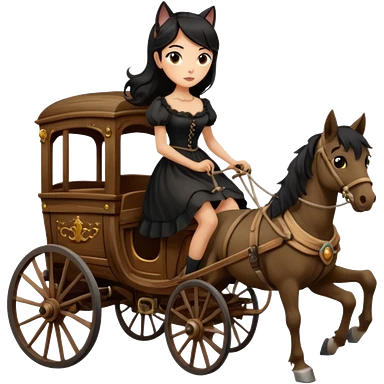 Rustic all black Lego antique wood Barbie Gypsy 1854 pretty dark-haired Catgirl driving a huge horse-drawn fancy French stagecoach Caravan on a bumpy scary ghost trail in the woods emoji | AI Emoji Generator