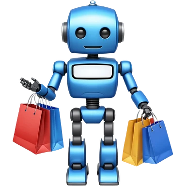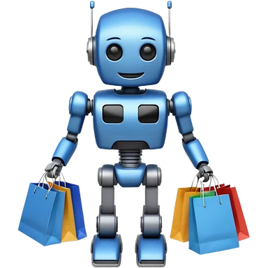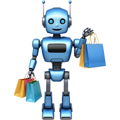 black friday robot with blue and metalic colours with bags in his hands emoji