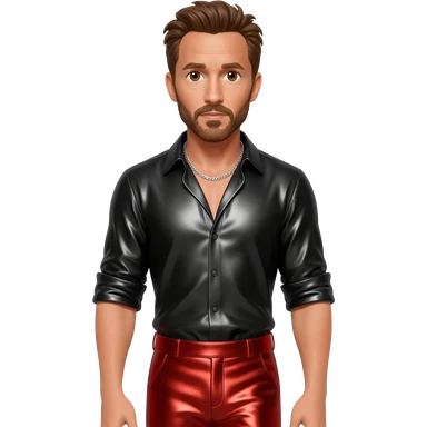 Ryan Reynolds with brown eyes, brown hair, black metallic shirt, red metallic baggy pants, silver necklace emoji