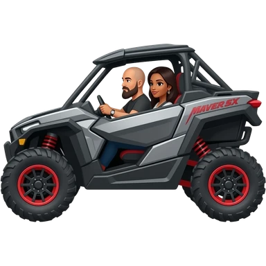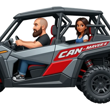 Side view of grey and red can am maverick sxs with guy driving (big bald guy with big beard) and wife in front side seat that’s dark tan with black hair emoji