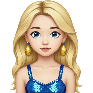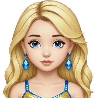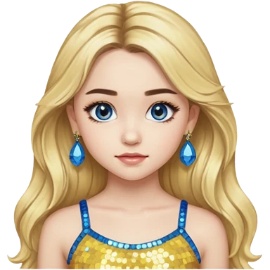 Sabrina Carpenter with long blonde hair, yellow sequin crop top, yellow earring, blue eye emoji