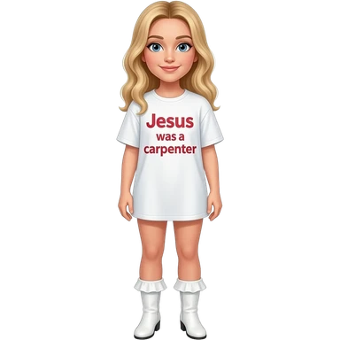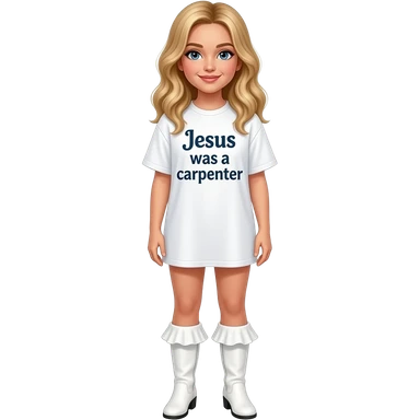 Sabrina Carpenter in an oversized white T-shirt that says “Jesus was a carpenter” and white ankle boots with white ruffle emoji