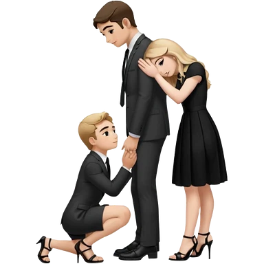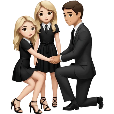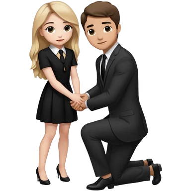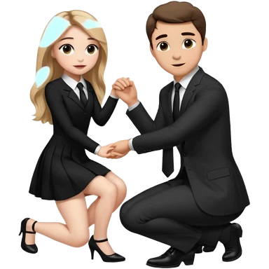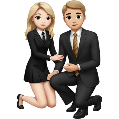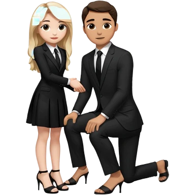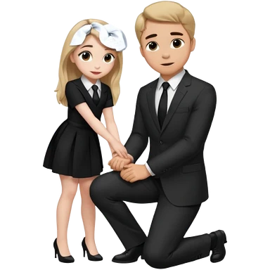 Sabrina carpenter kneeling down wearing a black dress with a tie, putting her hand on man’s leg who is standing emoji
