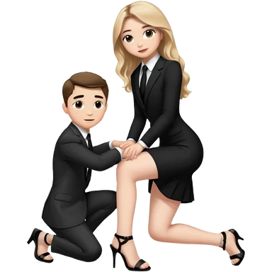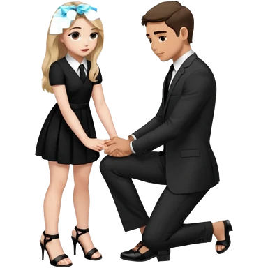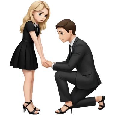 Sabrina carpenter kneeling down wearing a black dress with a tie with black heel sandals, putting her hand on man’s leg who is standing emoji