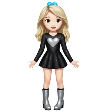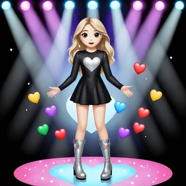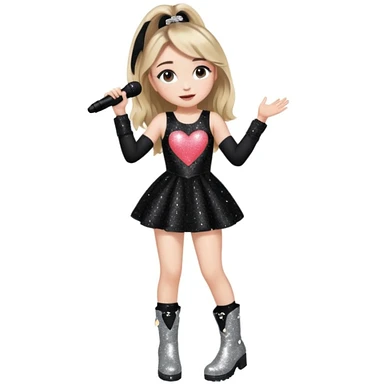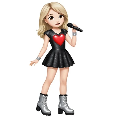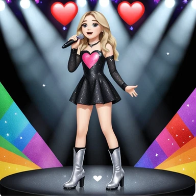 Sabrina carpenter singing at a concert wearing a black sparkly mini dress with silver at the end, with silver sparkly boots with heart cut out on the side. Colorful stage setting emoji