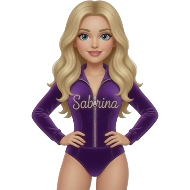 Sabrina carpenter blonde hair performing in a purple velvet bodysuit that has Sabrina written on it in sparkly rhinestones and it has a zipper emoji