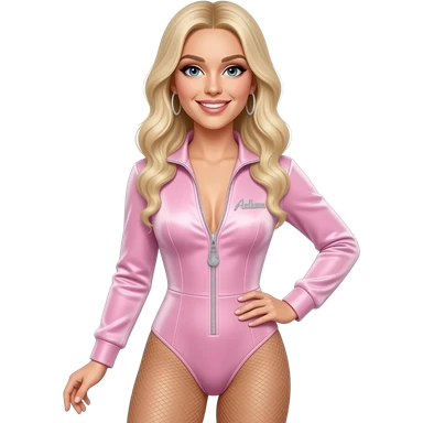 Sabrina carpenter blonde hair performing in a light pink velvet bodysuit that has Sabrina written on it in sparkly rhinestones and it has a zipper emoji